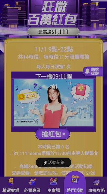 → newlife5566: 感謝樓上提醒整點搶的mo幣要當天用 114.44.33.50 11/01 10:35
