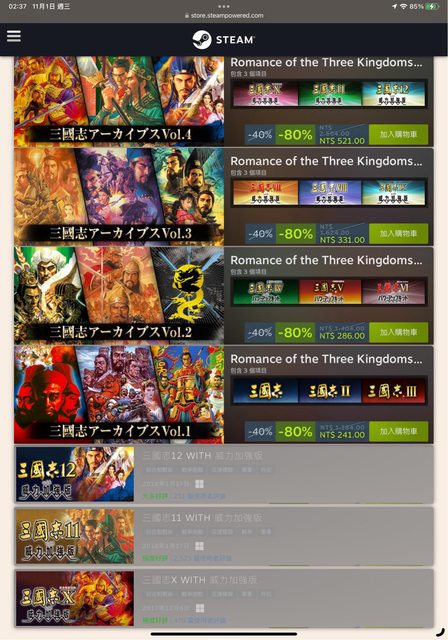 光榮三國志,40週年慶,幾乎光榮全系列遊戲都有折扣 https://reurl.cc/0ZnW4M 最主要的是三國志平常都是死豬價,但現在幾乎全面都是史低33折 https://i.imgur.com/m3IdCLG.jpg