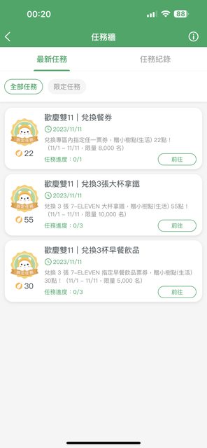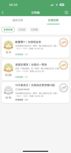 手機發文+首Po排版請見諒QQ 今天看到app彈出任務通知, 兌換專區內指定任一票券可贈點(有分現金券跟餐券), 我自己是換了現金券而已(最低100):全家購物金100元-贈小樹點11點, 另外有一個老朋友獨享任務贈25點也同時達成(不確定是否分眾), 現金券種類也蠻多可以選自己用得到的~ https://i.imgur.com/XUL88Ss.jpg