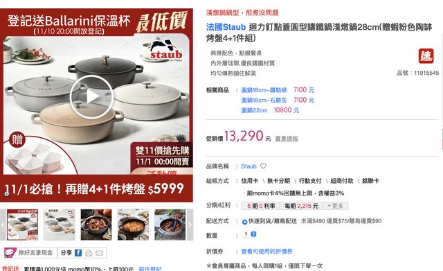昨天隔壁的同事興致勃勃跑來跟我分享雙11優惠 之前觀望他們家鑄鐵鍋但都買不下去 現在這些組合看起來是真的蠻划算的 有打折 也有優惠組合像是 淺燉鍋4+1件烤盤組合 原價13,290 優惠價5,999 https://i.imgur.com/LmuYSeg.jpg