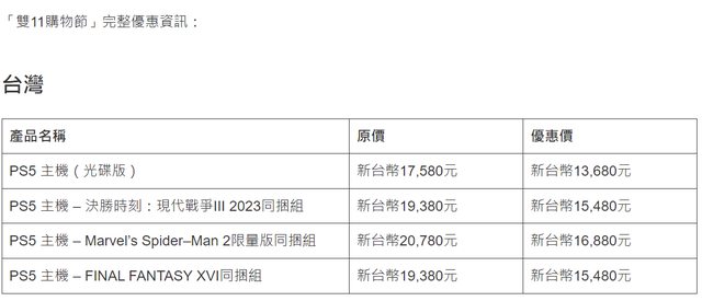 來源:Playstation官方 https://abuma.pse.is/5d24ec 很高興在此宣布今年的「雙11購物節」將於11月3日至16日展開。玩家在PlayStation授權 經銷商和SONY Store購買PlayStation 5主機,最高可節省新台幣3,900元!《決勝時刻: 現代戰爭III 2023》PS5同捆組將於11月10日遊戲發售當天同步推出,顧客可於11月3日起 開始預訂享受雙十一優惠。 隨著年末假期和慶祝活動逐步接近,現在正是購入PlayStation 5的最佳時機, 2023年上 市的大量暢銷大作 ——《霍格華茲的傳承》、《暗黑破壞神IV》、《FINAL FANATASY XVI》、《刺客教條:幻象》、《EA Sports FC 24》、《NBA 2K24》以及《Marvel’s Spider-Man 2》—— 更是不容錯過的必買遊戲。 https://i.imgur.com/XnLyLVE.jpg