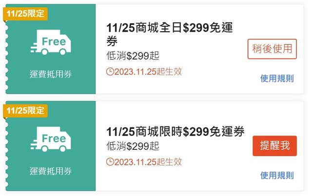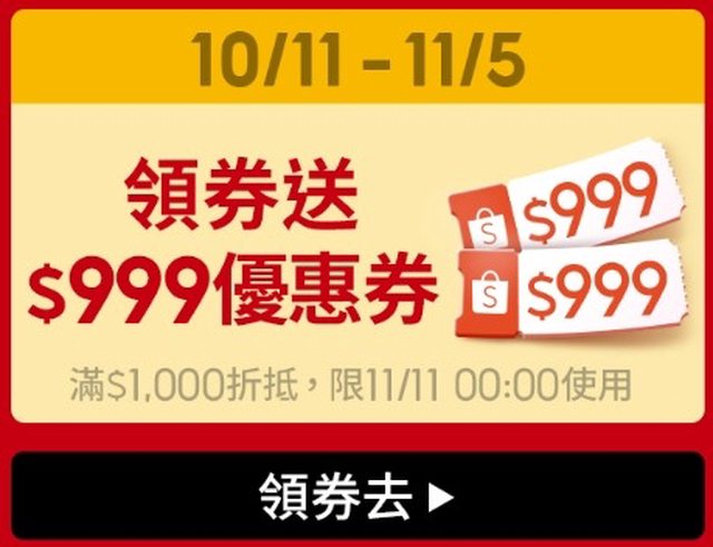 這次雙11終於有0元免運了== 雙11總共有11張,1張0元,6張99,4張499 https://reurl.cc/1G8VpV 先領免運有一張999 https://i.imgur.com/ngIdkFM.jpg