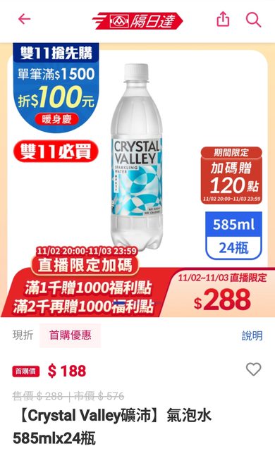 : 全聯線上購礦沛氣泡水$12/瓶 288 免運 到10/30