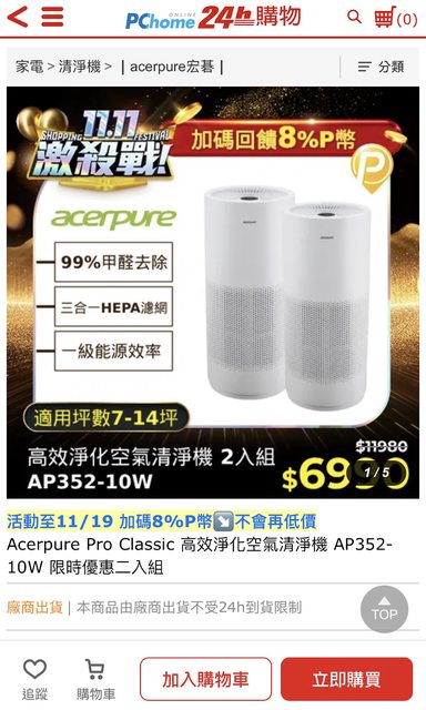 前陣子有在觀望Acerpure pro Classic 這台 等到雙11還真的優惠很多 https://i.imgur.com/EcZaOXR.jpg