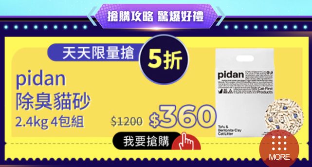 意外發現這個活動頁 昨晚發現五折品蠻可以買的 但我昨天太晚看到沒搶到5折的濕紙巾 今天是貓砂 分享給需要的朋友 https://i.imgur.com/hyvC6LS.jpg
