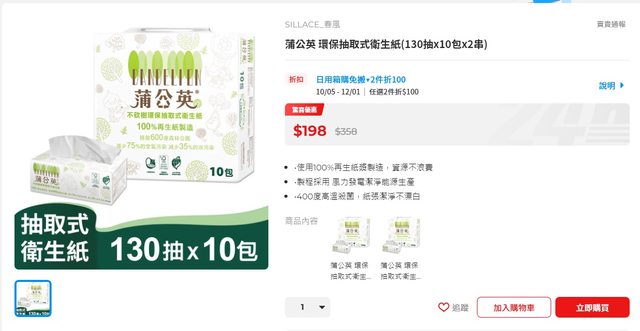 剛剛看被買完了 蒲公英 環保抽取式衛生紙 (130抽x10包x2串) https://i.imgur.com/opCjdDV.jpg