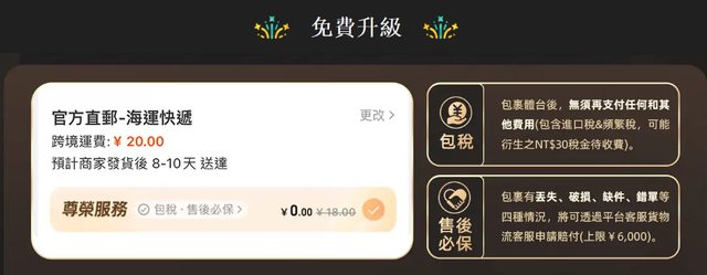 有時候不知道海外購物便宜還是台灣買,因為會有很多無形成本 像是包裹送來結果關稅超貴,或是東西送來結果尺寸不合或根本不能用 然後稅制又很麻煩,最後要以海關認定為主 之前買了3千多台幣收了快3百的關稅… 年底要去國外,所以想買一些保暖衣服 趁雙11想說看能不能撿一點便宜 但保暖類產品都很大件很厚,超怕稅金很貴 滑淘寶時發現有推一個尊榮服務 簡單來講就是有包稅跟售後保險 https://i.imgur.com/54bUNUc.jpg