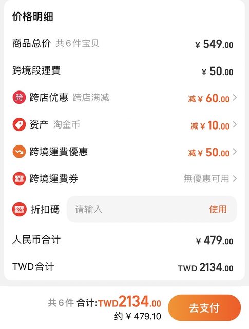 然後去結帳發現,6件商品原本549人民幣 跨店滿減60、淘金幣減10、運費滿減不用錢,最後這樣從549扣成479 https://i.imgur.com/fjITnu0.jpg
