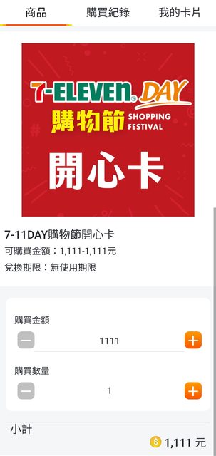 今年雙11統一的開心卡好像沒有很多人關注,剛剛買出奇地順利,這次是1111回饋100點 (約9%),結帳還有原本的0.5%,如果再搭其他信用卡的回饋,基本超過10%應該不難! 需要的自己去買囉! 對了,限量30000組,一帳最多買10張 是說今年買氣似乎還好 https://i.imgur.com/oZfcE64.jpg