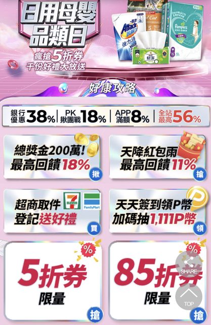 或是近期有去日本玩的朋友可以買這個 softbank日本5天上網吃到飽卡 $369 https://24h.pchome.com.tw/prod/DYAU0B-A900GPLMV 我自己另外推薦買這個 平常捨不得下手 現在竟然買一送一 法國 Kerastase 卡詩 金緻柔馭露 100ml x2 $1980 https://24h.pchome.com.tw/prod/DDBX03-1900GQ72Q 另外 剛看到今天似乎是日用品類日 11點還有搶券5折跟85折 有興趣的朋友可以看看 https://shopping.pchome.com.tw/activity/campaign/C475406216?banner=icon1_8 https://i.imgur.com/EVUR1x6.jpg