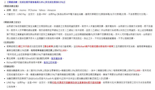 活動連結:https://pse.is/5d3b75 從現在到年底為止,首次註冊全盈+PAY會員並首次綁定台新銀行信用卡 首筆消費滿199元即贈66元的全盈儲值金 如果綁定的是@GoGo卡,每筆再享最高3.8%的刷卡金回饋(每月回饋上限1,000元) 用全盈+PAY拿來繳地價稅也可以享有回饋喔 提醒一下3.8%的回饋需完成指定任務才有喔 https://i.imgur.com/eEtzVWj.jpg