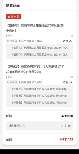 看到有人分享又有21%回饋 +折價券 蘋果汁竟然沒了... 第一單: 999+333=1332 1332-150折價券=1182 21%回饋=248 這樣整單等於再打7折 《盛香珍》 無調味綜合果量販盒700G/盒(28小包)x2 https://24h.pchome.com.tw/prod/DBAC77-1900C85NJ 【好麗友】 預感香烤洋芋片12入家庭號-起司204g+原味192g+洋蔥204g https://24h.pchome.com.tw/prod/DBAEF6-1900BYAHD 上次買~收到效期到明年 可以囤 https://i.imgur.com/7oGYvo5.jpg