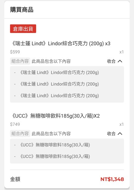 第二單: 599+749=1348 竟然UCC不能用折價券! 我剛算半天想說要最接近1111 竟然不能用 傻眼 但想說749真的便宜 還有P幣 就算了 收到21%回饋=283 這樣等於整單再打8折 瑞士蓮 Lindt Lindor綜合巧克力 (200g) x3 https://24h.pchome.com.tw/prod/DBAEFZ-1900GT090 UCC 無糖咖啡飲料185g(30入/箱)X2 https://24h.pchome.com.tw/prod/DBAJ92-1900FTNI9 https://i.imgur.com/WU10tvT.jpg