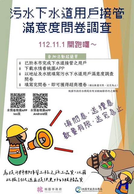 1.限制條件是桃園市有完成下水道接管的用戶。 2.下載app「水情看桃園」 3.以地址及水號填寫滿意度調查 4.簡訊傳送50元全家禮券 目前還有5萬份禮券 ----- Sent from JPTT on my iPhone -- ※ 發信站: 批踢踢實業坊(www.ptt.org.tw), 來自: 110.28.128.62 (臺灣) ※ 文章網址: https://www.ptt.org.tw/Lifeismoney/M.1699572628.A.F4A
