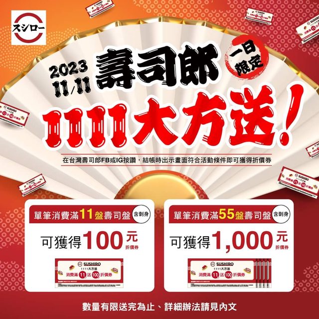 11/11 1日限定 數量有限 每11盤送100折價卷(上限55盤 300可用一張 假設一個人去吃 只吃40元的 40*11(這次消費)+40*8(下次消費) =760 760-100=660 660/760=0.86 大約86折 但我覺得不可能吃的那麼剛好,吃這樣也很辛苦 https://i.imgur.com/QbMHWng.jpg
