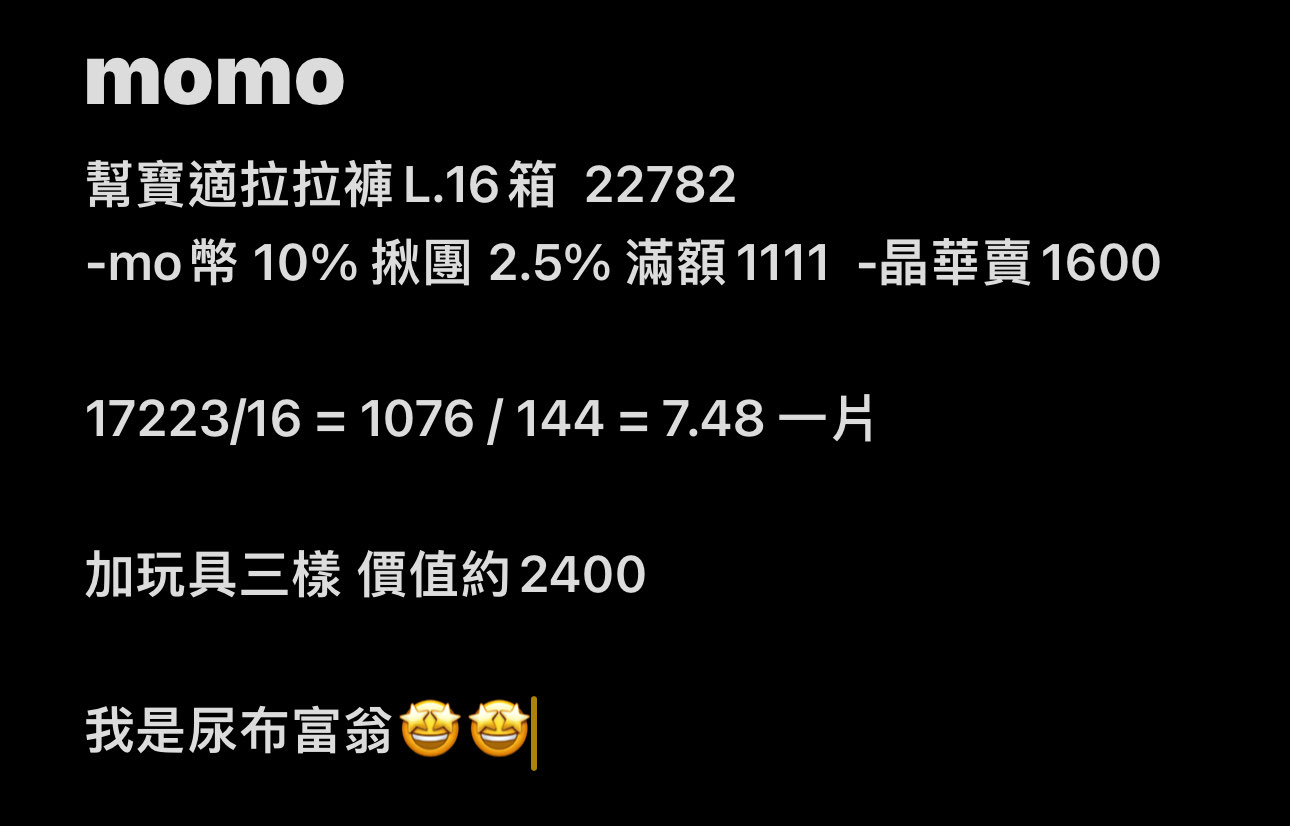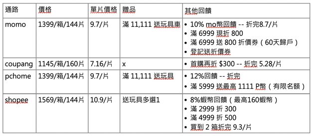 今年雙十一幫寶適的優惠整理分享給大家 以我們家用的幫寶適拉拉褲 L 整理 先說結論: 整體在coupang上面買最便宜,但就沒有送玩具 要在momo上買超過8箱單片價格才會最便宜…但家裡真的囤不了qq https://i.imgur.com/5aeCPMS.jpg