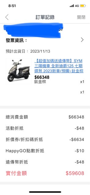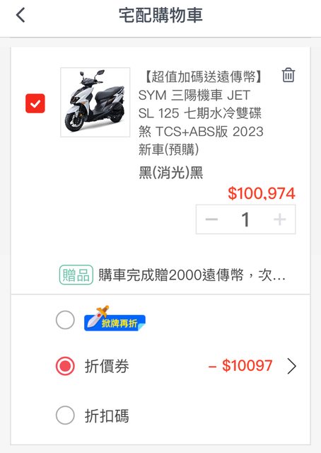 回饋一下,前一篇88折有人下面留言機車85折折了很多; 我這2天看了下有發9折券,我一個人就有3張可以折很多東西,目前看起來沒上限? 目前已下手機車搭配昨天的街口跟遠傳幣2000很划算 昨天試了下電視也能折 有要買機車的評估看看,也可以上去看看自己要買的能不能用折價券(我看不出那些類可 以用,目前能確定機車跟電視) 特別留意用券後最多3期0利率,買大額缺現金自己留意.. 附上訂單,跟購物車示意 朋友前幾天剛簽jet ,機車行是104000可以刷卡分期無代辦費那些 ,所以我覺得網路買這折扣付一些代辦費請半天自己去監理站報廢很可以 錢不夠只能買全新迪爵… 另外補充想分期多一點奇摩購物半夜都會偷偷跑出95折,有常在買奇摩購物金跟分期多點 的也可以考慮 https://i.imgur.com/gu7Asyw.jpg
