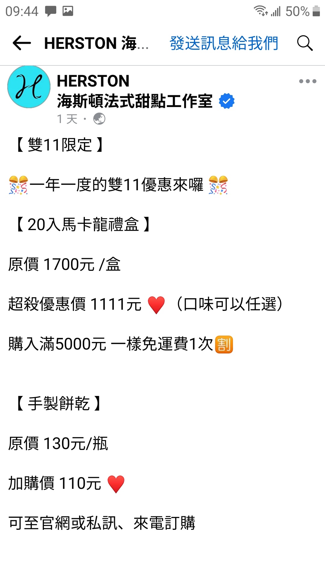 高雄小有名氣的海斯頓馬卡龍 line禮物雙11限定20入馬卡龍300元而已 可是官方FB是賣1111元(原價1700)欸? 感覺也太便宜 -- ※ 發信站: 批踢踢實業坊(www.ptt.org.tw), 來自: 101.139.16.103 (臺灣) ※ 文章網址: https://www.ptt.org.tw/Lifeismoney/M.1699665811.A.893