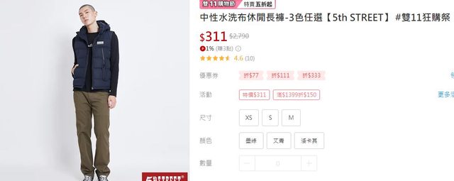 5th STREET 雙11特賣$111起 算起來都接近1折 感覺不錯!來試試看 店家應該是要換季清庫存了 https://ppt.cc/fLEhkx 休閒長褲目前看起來貨量蠻齊全 分享給大家 祝大家都可以搶好搶滿 https://ppt.cc/fGV2Ix https://i.imgur.com/mx79JZm.jpg