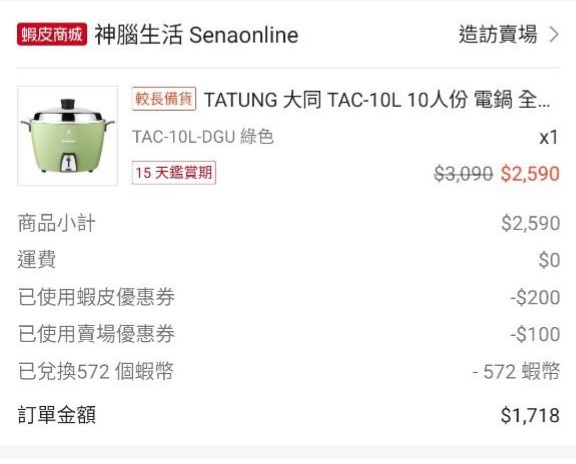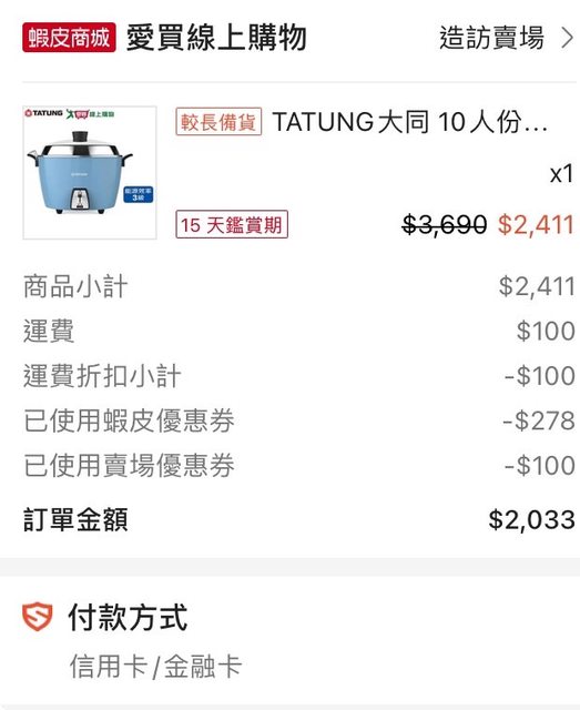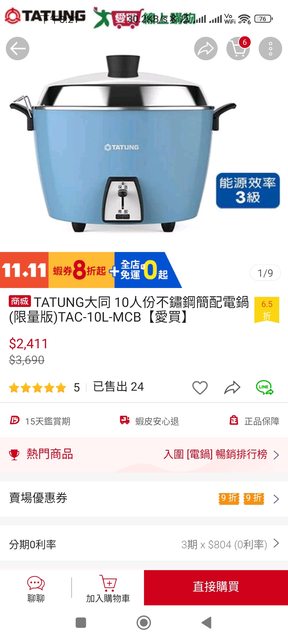 大同電鍋全不鏽鋼的藍色款,今天在蝦皮愛買跟家樂福商城都有在特價,但是愛買可以額外 combo折價券更便宜。 到蝦皮首頁頂的愛買廣告這邊點入可以拿愛買跟蝦皮的折價券。 https://i.imgur.com/JAEpfQ3.jpg