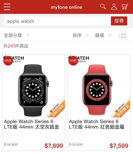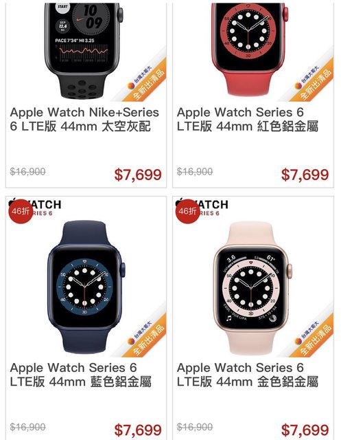 Series 6 LTE版 44mm $7,699 紅色鋁金屬錶殼+紅色運動錶帶 拆封新品 $7,599 https://i.imgur.com/5yECFJz.png