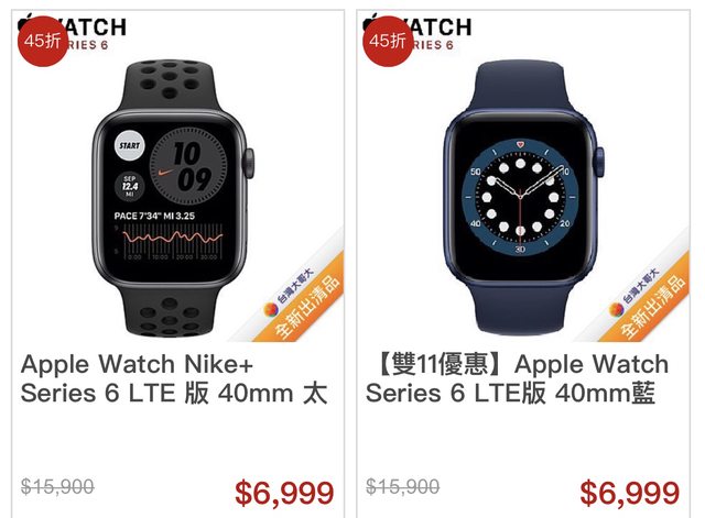 Series 6 LTE版 40mm $6,999 Nike+ 太空灰+黑色Nike 運動錶帶 藍色鋁金屬錶殼+藍色運動錶帶 https://i.imgur.com/E2i1ua2.png