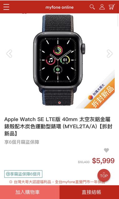 https://www.myfone.com.tw/mbuy/ SE LTE版 40mm $5,999 太空灰鋁金屬錶殼+木炭色運動型錶環 https://i.imgur.com/E4Bn57Z.jpg