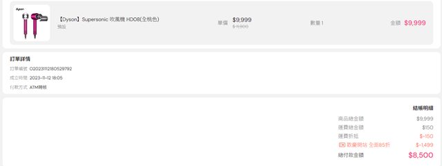TutorABC Shop應該是剛開站的關係到十一月底全站都有85折的優惠 原本Dyson HD08吹風機是$9,999,加上85折優惠下來只要$8500挺划算的 Dyson V10吸塵器換算下來也是差不多9500左右 晚點來研究一下他們平台的其他商品看看有沒有值得購入的 這邊附上連結~ HD08:https://reurl.cc/0ZeQ5o V10:https://reurl.cc/r6VoyN -- ※ 發信站: 批踢踢實業坊(www.ptt.org.tw), 來自: 123.51.235.136 (臺灣) ※ 文章網址: https://www.ptt.org.tw/Lifeismoney/M.1699784447.A.806