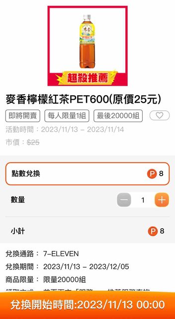 openpoint 麥香檸檬紅茶 11/13 凌晨0時8p兌換 http://i.imgur.com/FB4h7Eq.jpg