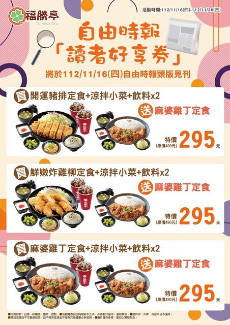大家最期待的自由時報優惠來啦 ! 112/11/16要記得去買報紙剪下優惠! 小編保證11/16頭版一定有優惠~ 憑券即可享購「買套餐送主餐」的優惠 超級划算的優惠大家要把握! 而且這次有更換定食品項喔! 大家可以一起來嚐鮮~~ 兌換日期 : 112/11/16-112/11/26 大家記得去買報紙!獲得優惠! *要買報紙剪優惠券才有優惠 *此為與報社的合作無任何政治立場 *不喜歡自由時報的粉絲我們就不要勉強等別的活動哦 -- ※ 發信站: 批踢踢實業坊(www.ptt.org.tw), 來自: 101.136.245.232 (臺灣) ※ 文章網址: https://www.ptt.org.tw/Lifeismoney/M.1699844155.A.0F1