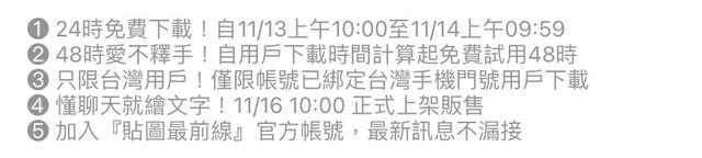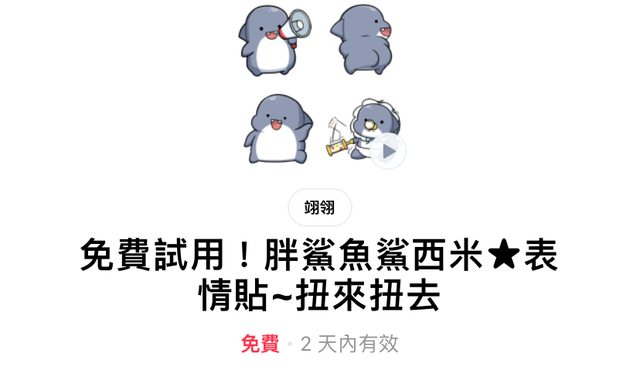 主辦單位:LINE貼圖最前線 活動日期:11/13 10:00~11/14 9:59 活動內容: 兩款表情貼免費試用48小時 +活動邀請再送1P(上限20P) — 胖鯊魚 https://tinyurl.com/bddsv38f https://i.imgur.com/jxX3H36.jpg