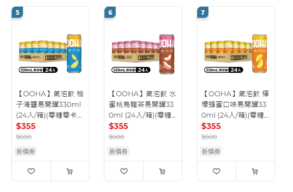 250ml(24入)$249 https://reurl.cc/6Q424d 330ml(24入)$315 https://reurl.cc/L6x3xe 箱購價錢跟momo、蝦皮、東森差不多,但比價過後,pc有券可以現折目前應該是算最划算 的 以330ml 24罐/箱這樣算下來 315*4-100=1160/96=12元/罐 另外舒味思氣泡水500ml 24入/箱 買一送一 $720也可以用 算下來也是目前最低的 https://reurl.cc/QZldlq 有需要快樂水的各位可以參考看看 -- ※ 發信站: 批踢踢實業坊(www.ptt.org.tw), 來自: 37.19.205.183 (日本) ※ 文章網址: https://www.ptt.org.tw/Lifeismoney/M.1699876547.A.506