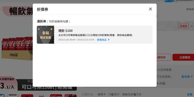 剛剛發現PC家有可口可樂有折價券,滿1111-100 https://i.imgur.com/UIiES1t.png