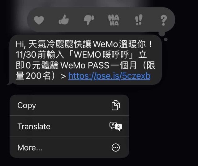 發文時可用 Ctrl+Y 刪除以下提醒。 若文章易引起多人推文違規(ex:推薦碼、徵求、合購、交易) 建議於文章放上紅色提醒 請注意!禁止發表有關[抽獎]、[紅利/推薦碼](含間接暗示等 ex:站內信)之文章/推文 情報文三十天內限發10篇!(自刪/被刪亦佔額度),亦禁止發推文代(合)購、徵求! 發文前請詳閱置底板規 剛收到簡訊 11/30前輸入「WEMO暖呼呼」 立即0元體驗WeMo PASS一個月(限量200名) https://pse.is/5czexb https://i.imgur.com/xNO5Lsi.jpeg