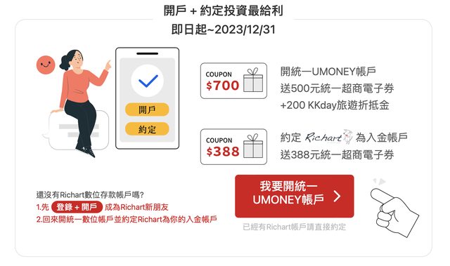 前幾天看IG有人分享 板上好像沒有相關的資訊 https://digital.pscnet.com.tw/richart/ 活動1:開戶送面額700元的優惠券 A 500元統一超商電子券 B 200 KKday旅遊折抵金 活動2:若綁定台新Richat為入金帳戶 再送388元統一超商電子券 http://i.imgur.com/nTuu3WB.jpg