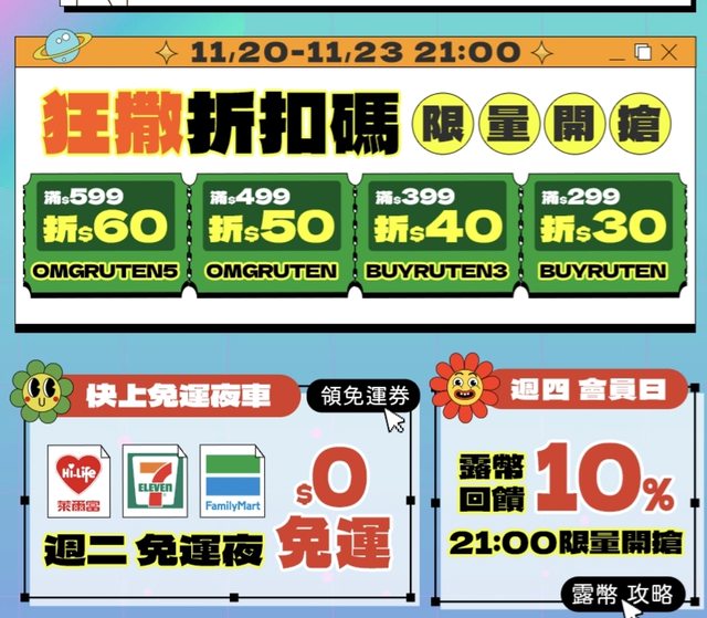 連續四天 晚上九點 599-60 499-50 399-40 299-30 然後星期二 晚上 還有免運 https://i.imgur.com/8llBQ9S.jpg