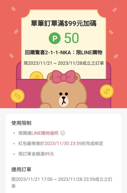 Line購物回購驚喜2-1-1-NKA 滿99回饋50紅包 https://i.imgur.com/59IoFGI.jpg