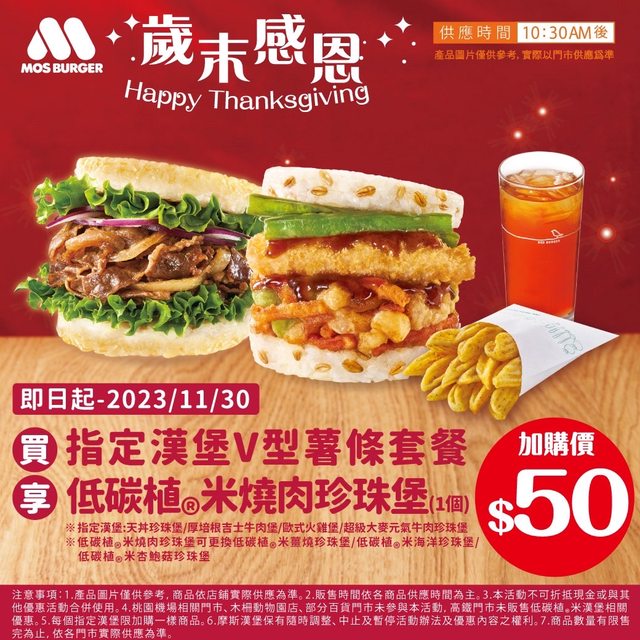 10:30後指定漢堡V薯套餐+$50低碳植米燒肉珍珠堡 https://i.imgur.com/TzoDCgg.jpg