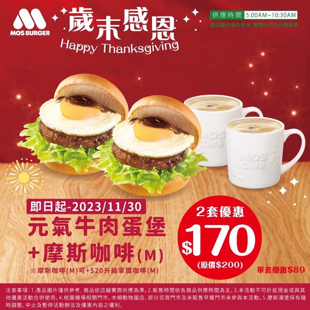 https://www.mos.com.tw/news/news.aspx?id=806 即日起~11/30 5:00~10:30元氣牛肉蛋堡x2+摩斯咖啡x2=$170 https://i.imgur.com/wrNkIo1.jpg