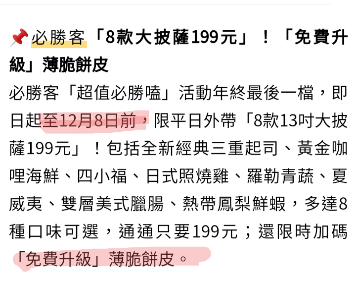 推 ringfan: 兩家特價都吃過,必勝客真的還是比較好,118.166.23.219 11/28 19:47