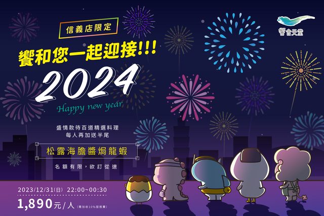 【饗食天堂】 時間:12/31(日)22:00~00:30 地點:饗食天堂信義店 內容: 1,890元/人(加收10%服務費) 跨年場限定加贈半尾松露海膽醬焗龍蝦 備註: 看你覺得看跨年煙火算不算省錢點,如果算的話 能夠在跨年當天吃饗食天堂的龍蝦配跨年煙火應該是個蠻不錯的體驗 https://i.imgur.com/8HTV7iu.jpg