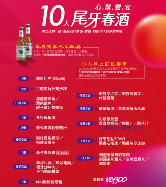 年末聚餐的時間又到了 平常就很愛關注餐廳訊息 今天來跟大家分享近期年末聚餐的優惠資訊 也歡迎大家一起來分享年底的用餐資訊 希望每個人都能用期待的心情繼續迎接2024年 【瓦城】 時間:11/01~02/29 內容:10人尾牙宴 優惠: 限時優惠價8,900元 招待勝獅啤酒10瓶 備註: 它其實還有30人的優惠活動, 只是我覺得這個比較偏公司有尾牙需求時的選擇 所以可以推薦給你老闆知道(? https://i.imgur.com/BUHh288.png