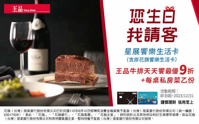 【王品牛排】 時間:~12/31 優惠: 刷星展饗樂生活卡(含原花旗饗樂生活卡) 王品牛排最優九折 每桌私房菜乙份 備註: 包含星展在內,中國信託和合作金庫都有刷卡優惠活動 另外也建議可以辦王品瘋美食會員 根據不同信用卡消費,最高可以回饋到9% https://i.imgur.com/EWQE990.jpg
