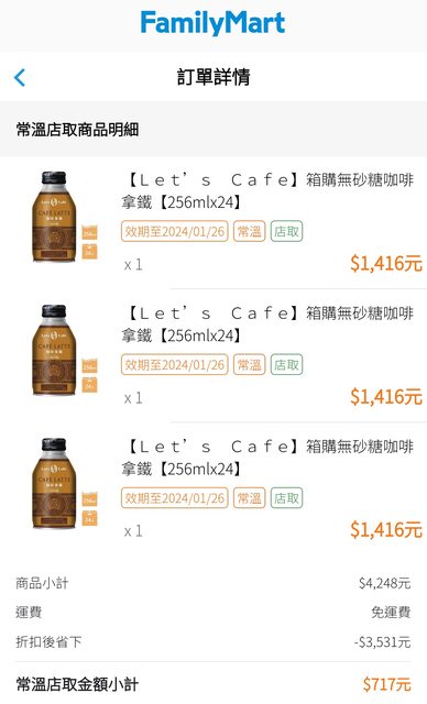 https://gpmb.family.com.tw/appStore/mall/item/WB2300083820 Let’s Cafe箱購無砂糖咖啡拿鐵(256mlx24) 效期至2024/01/26 常溫店取 原價$1,416元 特價$239元 剩餘 696 份 日本製UCC代工一瓶10元應該還行吧! 先買個三箱壓壓驚,應該幾小時就沒了。 https://i.imgur.com/SWsDTo7.jpg