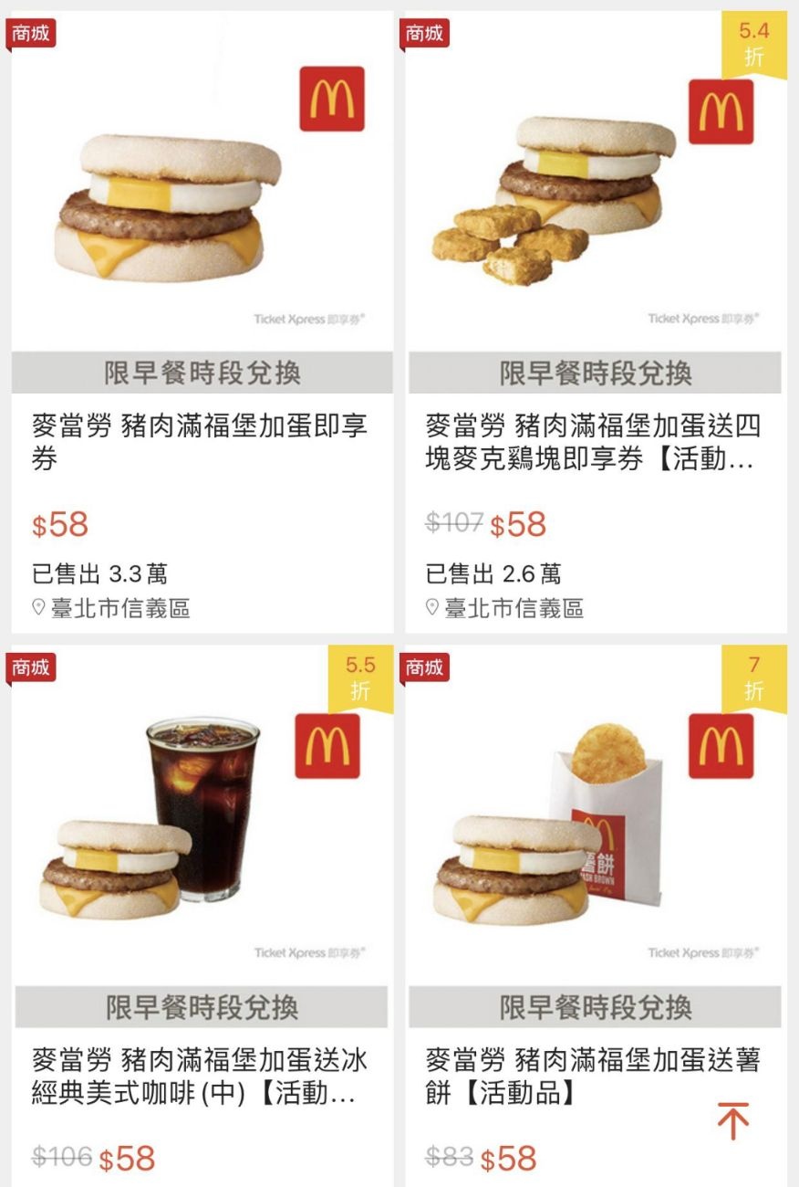 這次蝦皮有麥當勞耶 補個連結 豬肉滿福堡加蛋+薯餅 $58 https://reurl.cc/dmZRDM 豬肉滿福堡+熱經典那堤 $75 https://reurl.cc/K3gZ0y 麥香鷄+麥香魚+六塊麥克鷄塊+可樂(中)*2 $212 https://reurl.cc/blpMlX 蕈菇安格斯牛肉堡+可樂 (中) $120 https://reurl.cc/Nye3yQ 勁辣鷄腿堡+熱經典那堤(中) $120 https://reurl.cc/x6qd6e 勁辣鷄腿堡+冰經典那堤(中) $120 https://reurl.cc/v6Nr6j 十塊麥克鷄塊+熱經典美式咖啡(中) $122 https://reurl.cc/0ZNLZA 十塊麥克雞塊+冰經典美式咖啡(中) $122 https://reurl.cc/GK074x 麥克鷄塊10塊+薯條(大)+可樂(中) $180 https://reurl.cc/V4VKNY 大麥克+薯條(大)+可樂(中) $150 https://reurl.cc/z690la 雙層牛肉吉事堡+勁辣鷄腿堡+六塊麥克鷄塊+可口可樂(中)*2 $199 https://reurl.cc/p5E7rQ BLT安格斯牛肉堡+可樂 (中) $120 https://reurl.cc/2EqXYr -- ※ 發信站: 批踢踢實業坊(www.ptt.org.tw), 來自: 223.137.228.223 (臺灣) ※ 文章網址: https://www.ptt.org.tw/Lifeismoney/M.1701400128.A.C24