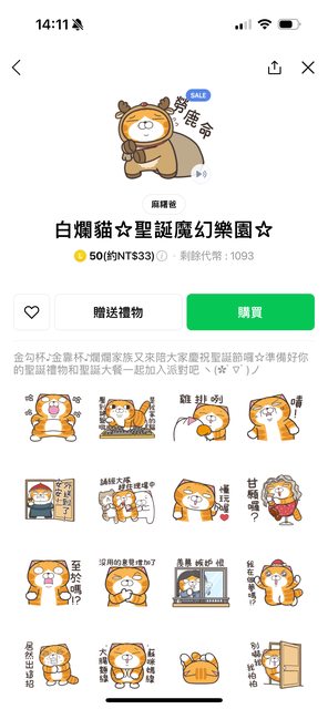 貼圖5折~分享給大家。 https://lin.ee/cji1oAa3/crtw 這次有白爛貓, 大家可以先把聖誕貼圖買起來放~ https://i.imgur.com/mB2KZx3.png