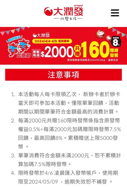 大潤發4/4-4/5限時會員活動 消費滿2000送160發幣 發幣滿好用的之後能直接折現金 https://i.imgur.com/tq4Yohn.jpeg
