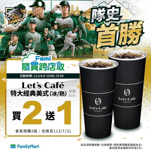 【台鋼雄鷹- 隊史首勝Get!】 全家與球迷朋友們一同歡慶,見證隊史紀錄 台鋼雄鷹 TSG HAWKS 隨買跨店取限時優惠 113/4/4 10:00-23:59 FamiCollection天然水610ml — 買1送1 威德運動補給飲料 — 買1送1 經典美式(特大杯,冷熱不限) — 買2送1 *各品項限購組數、兌換期限,請依實際購買畫面為主。 https://i.imgur.com/q43b4ny.jpg