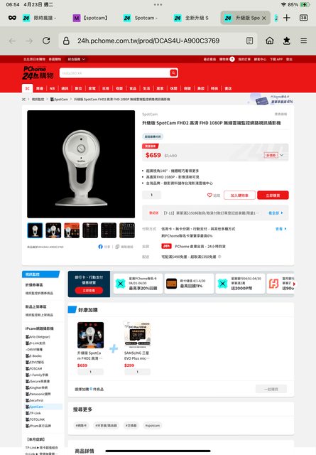 一個多月前看到限時瘋搶特價999沒買到, 昨天搜尋出現659特價, 馬上下單來替換4月1日停止服務的Beseye, 覺得Beseye停止服務很可惜。 結果今天早上再次搜尋, 出現更低價$621, 數量還比659還多。 都想買來房子內外到處裝了。 https://24h.pchome.com.tw/prod/DECE31-A900C7H67 https://i.imgur.com/u07FWVM.png