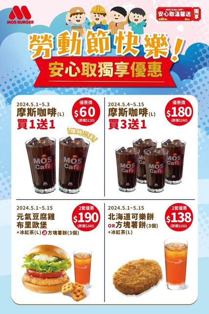 五一勞動節即將來臨,MOS向廣大勞工致敬, 推出眾多 #安心取獨享優惠 商品優惠 . 5/1~ 5/3 限時三天 #摩斯咖啡 (L) 買一送一 ————— 平均單杯$ 5/4 ~ 5/15 #摩斯咖啡 (L) 買三送一 ————— 平均單杯$ #指定元氣早餐 元氣豆腐雞布里歐堡+冰紅茶(L) 送方塊薯餅(3個) ————— 套優惠價$ #指定點心優惠 北海道可樂餅 or 方塊薯餅(3個) +冰紅茶(L) https://i.imgur.com/XQshJSO.jpeg